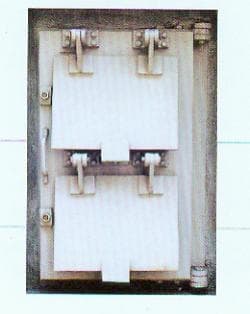 一种悬板式防爆波活门,门框墙和活门均由钢筋混凝土浇筑而成,钢门框上连接铰耳,并与活门铰接,垂直于活门表面开有通风孔,通风孔外面置有至少一块悬板,悬板上端与铰座铰接,活门上开有四至八个通风孔,其通风孔的纵剖面为锥形,大端在门内侧,小端在门外侧,通风孔与悬板配合密封,悬板密封面贴有橡胶板,关闭时与活门表面紧密贴合;活门相对于悬板下摆的中间位置固定有限位座,限位座的限位板角度与悬板开启角度相同,限位板下表面固定有胶垫;门框墙外包有钢门框,钢门框四角部位置焊接锚钩预埋件,钢门框靠近门框铰耳一侧连接铰耳预埋钢板,铰耳预埋钢板和锚钩预埋件相交叉并锚固在门框墙内。解决了通风孔与悬板密封时容易出现漏风的问题和悬板开启角度不易控制、门框易松动的问题。