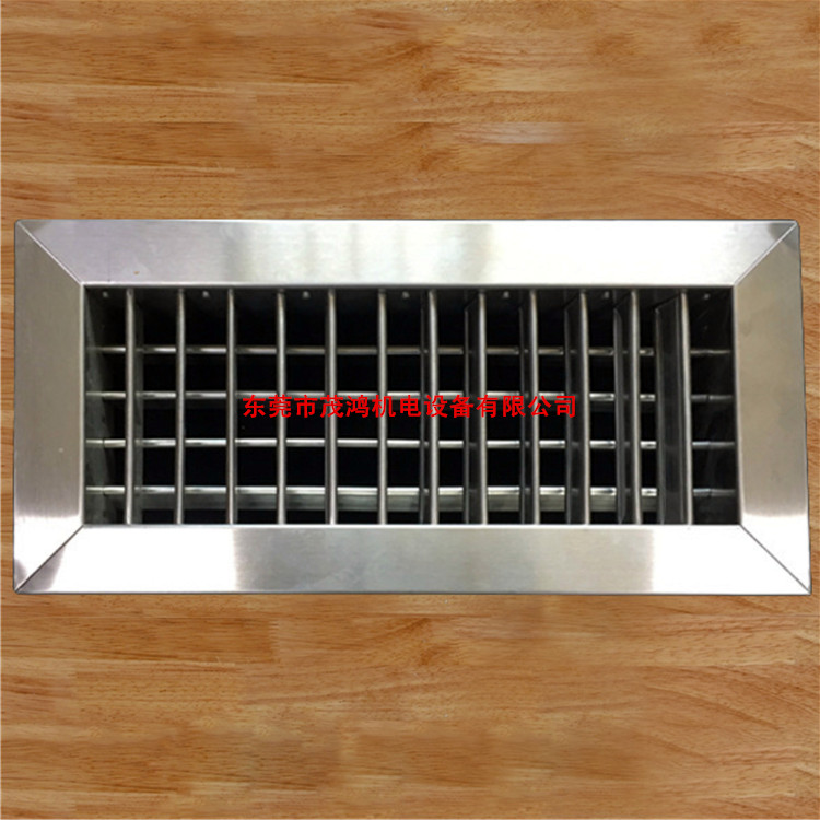 双层百叶风口,广东省泛应用于空调系统中作送风口,根据使用要求,风口后面可配制铝制风量调节阀(人字闸),双层百叶风口具有两层相互垂直叶片调节水平和垂直叶片的角度,调整气流扩散面以改变射程。