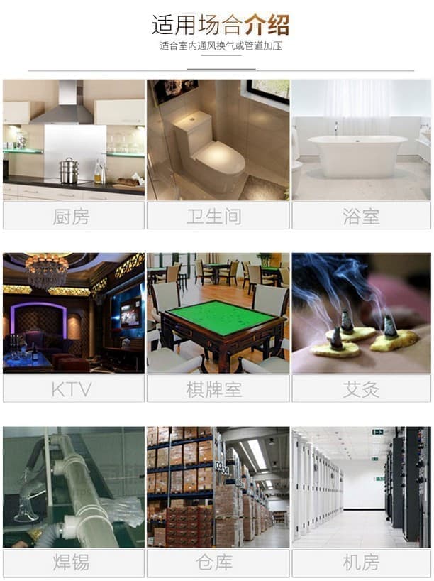 管道风机,用于抽(送)风和管道加压,接在管道的前端,末端,或者中段,效果都是一样的。适合任何角度安装,简单方便。