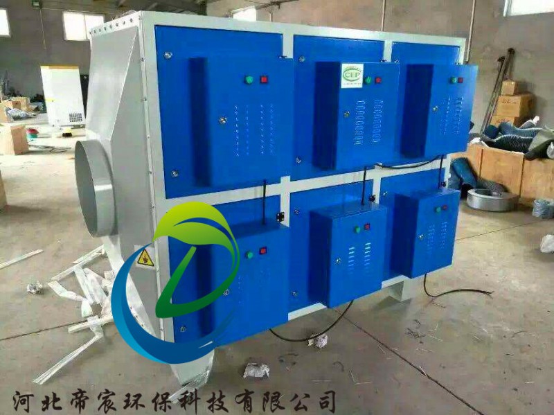 当废气进入净化设备内时,先经过等离子体化学反应过程,即电子首先从电场获得能量,通过激发或电离将能量转移到分子或原子中去,获得能量的分子或原子被激发,同时有部分分子被电离, 从而成为活性基团;之后这些活性基团与分子或原子、活性基团与活性基团之间相互碰撞后生成稳定产物和热。(在外加电场的作用下,介质放电产生的大量携能电子轰击污染物分子,使其电离、解离和激发,然后便引发了一系列复杂的物理、化学反应,使复杂大分子污染物转变为简单小分子安全物质,或使有毒有害物质转变成无毒无害或低毒低害的物质,从而使污染物得以降解去除。)