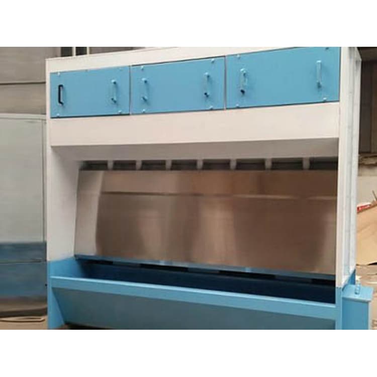 水帘柜(非标准)是利用流动的帘状水层来收集并带走漆雾,水帘由专用的回圈水泵维持,调节阀调节水帘大小,以控制水帘形状的完整;水箱下部设置过卷台,是将水帘冲击下来的漆雾由抽风装置形成;