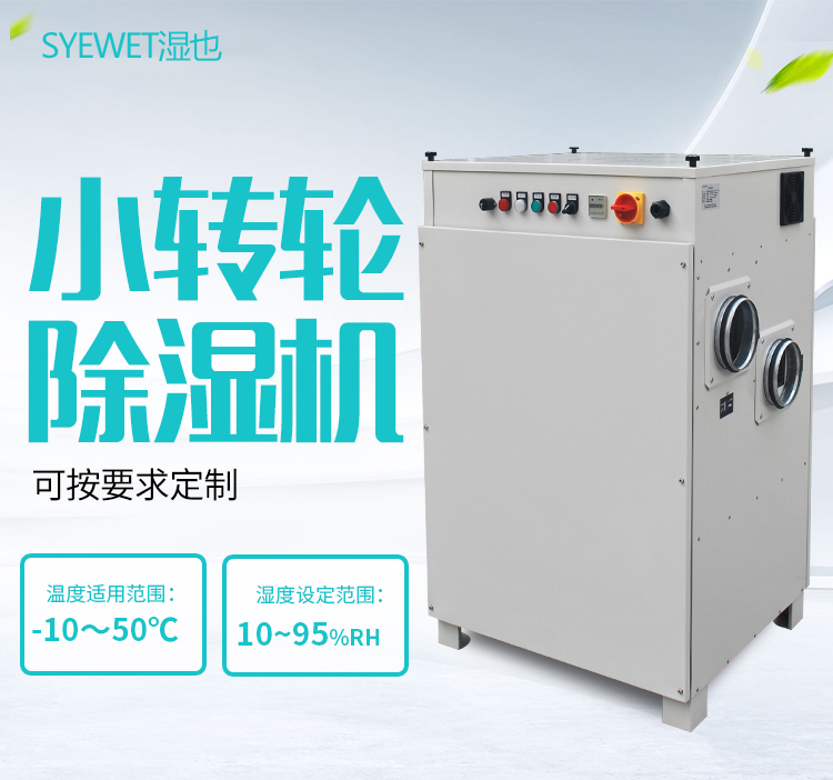 转轮除湿机工作原理—转轮式除湿机的除湿原理1、利用涂布在转轮上的硅胶将空气中的水份以物理方式吸附于具多孔性之合成硅胶上,然后在转轮再生区,将吸附在硅胶孔洞的水气加热汽化,至交流式热交换器入口处,形成高温高湿的空气,接着再经过已被室内冷湿空气降温冷却的热交换器时,由于露点差异而成凝结水排出。