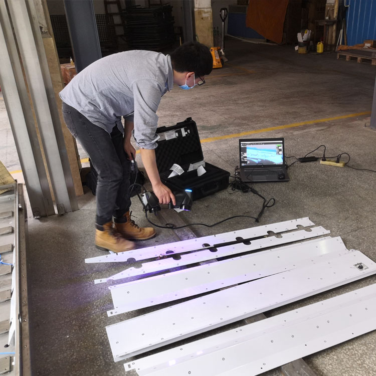 2.我司采用手持式三维激光扫描仪MetraSCAN3D,FASHIONJIE,CN,扫描速度快,精度高。首先工程师对客户的钣金件进行简单贴点,即可开始扫描。