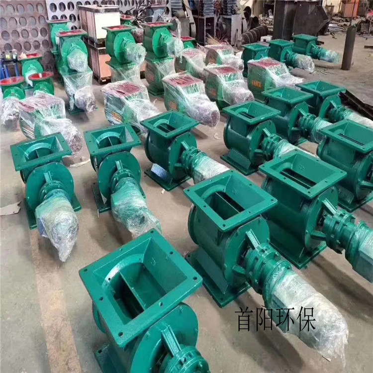 当上部料仓的物料靠自重落下充填在叶片之间的空隙中,随叶片的旋转而在下部卸出,因此,星型卸料器可以定量而连续地卸料。因此星型卸料器的上、下法兰口基本是方形或圆形,也可以由用户选定。