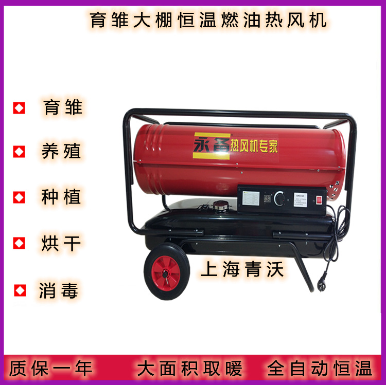 燃油热风机主要应用于大型厂房供暖、工厂车间取暖、养殖育雏加温、工业厂房采暖、农业大棚加温等,由于燃油热风机移动方便,升温迅速,热风温度稳定,不会出现忽冷忽热现象,机器自带恒温功能,当温度到达设置温度之后即停止耗油,低于设置温度2度后重新自动开启工作,取暖加温方便快捷,即买即用,无需任何安装,加油方可使用。给厂房车间带来了不可替代的便利,是冬季取暖加温的不二选择,相信燃油热风机将会为更多的厂房车间所使用,我公司出售的燃油热风机和其他同行业的产品相比较,油耗更低,质量更稳定,售后更有保障,我们的产品整机质保1年,有任何的产品技术问题,我们一定尽全力的为您解答,保证知无不言,言无不尽。燃油热风机现面向全国诚招代理商,希望有意者联系上海青沃实业有限公司,我们真心的希望可以与您合作。