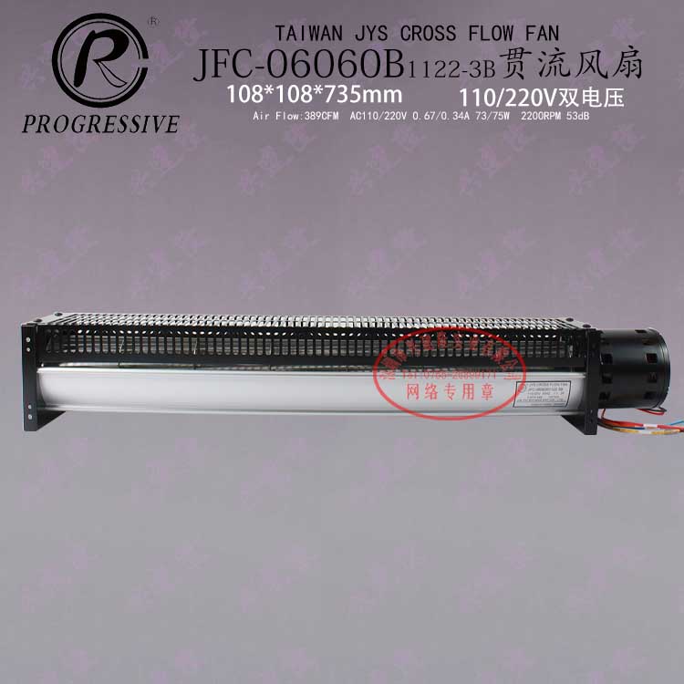 台湾金亿翔JYS贯流风机JFC-06060B1122-3B,与JFC-06060A1122-3B仅电机方向相反,两款风机对称使用,散热长度达1470mm2200转高转速大风量横流风扇,双滚珠轴承,扇叶直径为60mmAC230V,散热长度为680mm,风机总长度(含电机)是735mm,机柜设备用贯流风机!