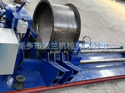 新乡市法兰机械有限公司研制开发的圆筒翻边机,该机结构形式为二模侧旋压式。下模安装在主动轴上,由电机带动,需要旋压工件放到上模上面,通过调节二端四个托辊和后顶轮控制圆管不让其左右、前后摆动。上模在45度角处向下方旋压,当上辊的下压力超高材料的屈服极-限时,便使所卷制的材料变形,根据要求当达到需要弧度或角度时,停止向下受力完成一次操作。