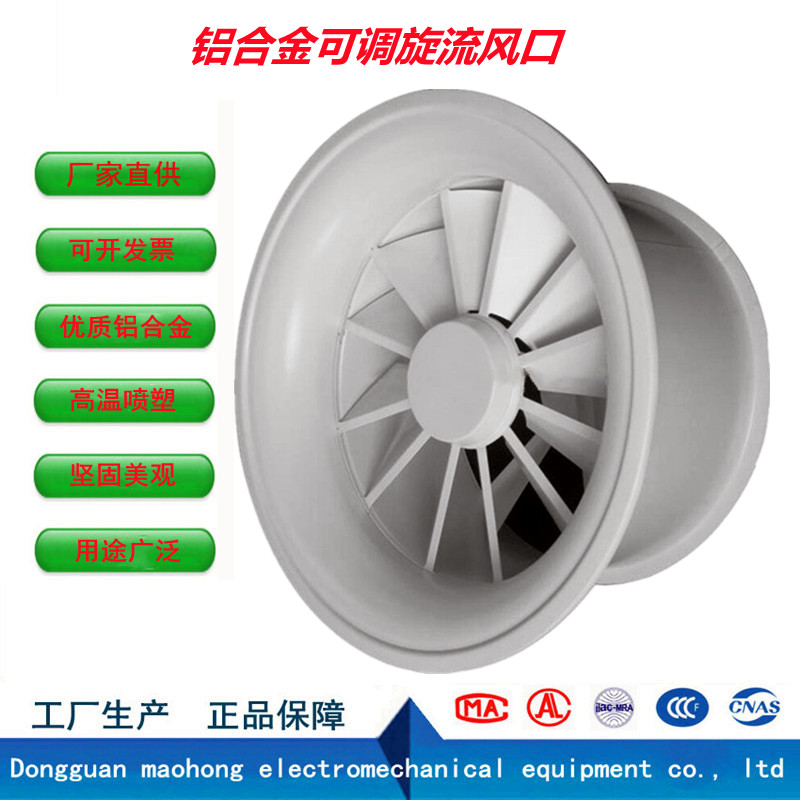 可调旋流风口的叶片是根据力学原理设计的,可使气流形成具有一定初速的旋流,从而送风射程远,射流覆盖面广,气流的对流增强,叶片可根据送风工况的不同而改变送风角度。可调旋流风有手动控制、电动控制、红外线远程遥控,广泛用于机场、车站、剧院、体育馆、厂房、大型会议室、商场等。