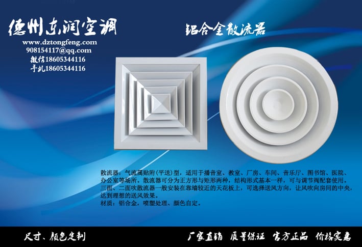 FK-10方形散流器,气流属贴附(平送)型,适用于播音室、教室、厂房、车间、音乐厅、图书馆、医院、办公室等场所。散流器可分为正方形与矩形两种,结构形式基本一样,可与调节阀配套使用。三面、二面吹散流器一般安装在靠墙较近的天花板上,可选择送风方向,让风吹向房间的中央,达到理想的送风效果。方形散流器为www.dzkongtiao.com铝合金制做,表面经过阳极氧化处理;也可按用户要求进行烤漆或静电喷塑,颜色按用户要求选择。方形散流器可以按用户要求配上调节阀或过滤网。FK-31型风口是在FK-10的基础上发展而成的,其差别:FK-10是正方形,FK-31型是长方形,结构形式基本上一样。
