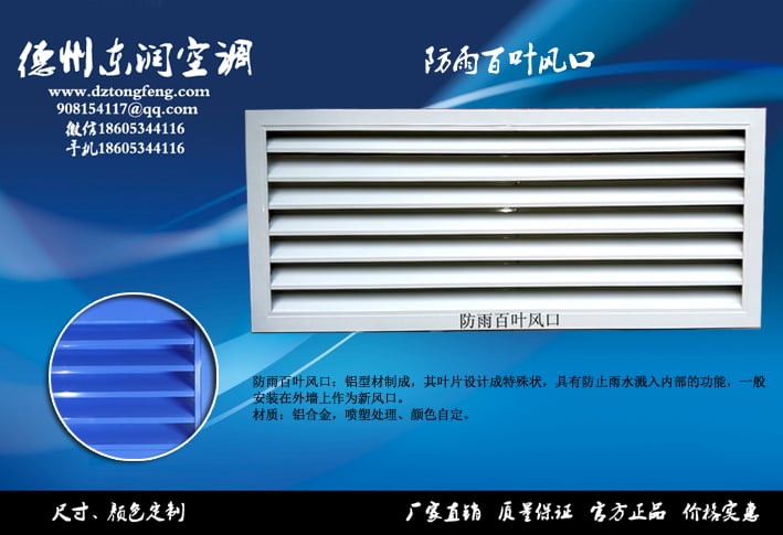 防水百叶风口与回风百叶风口有相似的结构和相同的性能,其叶片设计成独特的形状,具有防止水溅入内部的功能,一般作安装在外墙上的通风口。