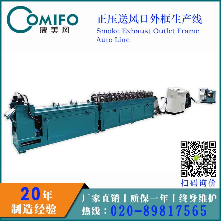 自动完成加压送风口(排烟口)外壳开卷,校平,冲口,冲孔,辊压成型,折方。此外壳属康美风自主研发,专利产品。