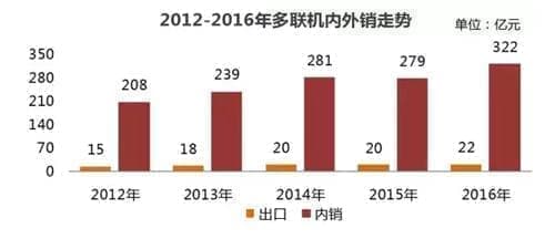 2016年多联机行业整体增幅达到15.03个百分点,其中内销规模与去年同期相比增长15.42%,外销增长9.64%。分析多联机行业增长原因不难发现,一方面 2016年繁荣的家用市场源源不断的为多联机行业注入增长动力。另一方面,企业在其推广和产品升级方面的投入也起到了推动作用。2016年中央空调企业加强区域市场建设,积极拓展区域市场。如麦克维尔江苏常州旗舰店,格力慈溪旗舰店、湖南海信中央空调旗舰店、三菱重工K标店等,更多专卖店的建设也使消费者对多联机产品认可度提升,间接挖掘了潜力市场。