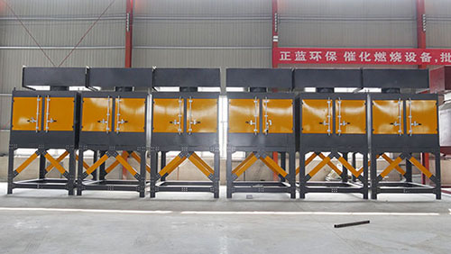 催化燃烧设备是使废气在催化剂的催化作用下在250~350℃的温度下发生氧化分解的废气处理设备。由于催化剂加速了氧化分解的历程,大多数VOCs有机物在250~350℃的温度时,通过催化剂就可以氧化完全。相对于直接燃烧设备680~1050℃的高温,催化燃烧设备具有更多的优势。