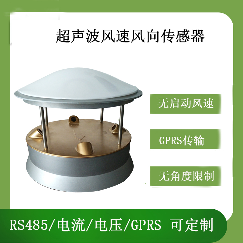 超声波风速风向传感器又名超声波风速风向计、超声波风速风向仪,是一款基于超声波原理研发的风速风向测量仪器,利用发送的声波脉冲,测量接收端的时间或频率(多普勒变换)差别来计算风速和风向。该传感器可以同时测量风速,风向的瞬时数值,支持电流、电压、RS485,GPRS无线上网等信号输出。整机外壳采用ABS材质,具有重量轻、没有移动部件、坚固实用的特点,而且不需维护和现场校准,能同时输出风速和风向。可以与电脑、数据采集器或其它具有RS485或模拟输出相符合的采集设备连用。