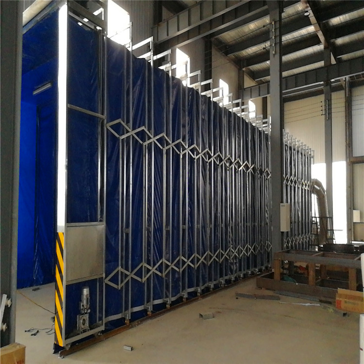 移动式喷漆房是配备废气处理设备及除尘设备使用的一种大型环保设备。主要用于体积大、重量重的工件喷漆或者打磨使用。移动伸缩房收拢时,将工件用行车移动至伸缩房内的适当位置,再将伸缩房神展开,在伸缩房内进行喷漆作业就可以了。作业完成后,合拢伸缩房,将喷漆后的产品用行车挪走,移动伸缩房的使用使工作场地的使用更科学合理。