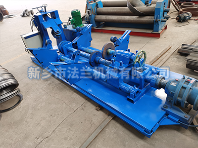 新乡市法兰机械有限公司研制开发的圆筒翻边机,该机结构形式为二模侧旋压式。下模安装在主动轴上,由电机带动,需要旋压工件放到上模上面,通过调节二端四个托辊和后顶轮控制圆管不让其左右、前后摆动。上模在45度角处向下方旋压,当上辊的下压力超高材料的屈服极-限时,便使所卷制的材料变形,根据要求当达到需要弧度或角度时,停止向下受力完成一次操作。