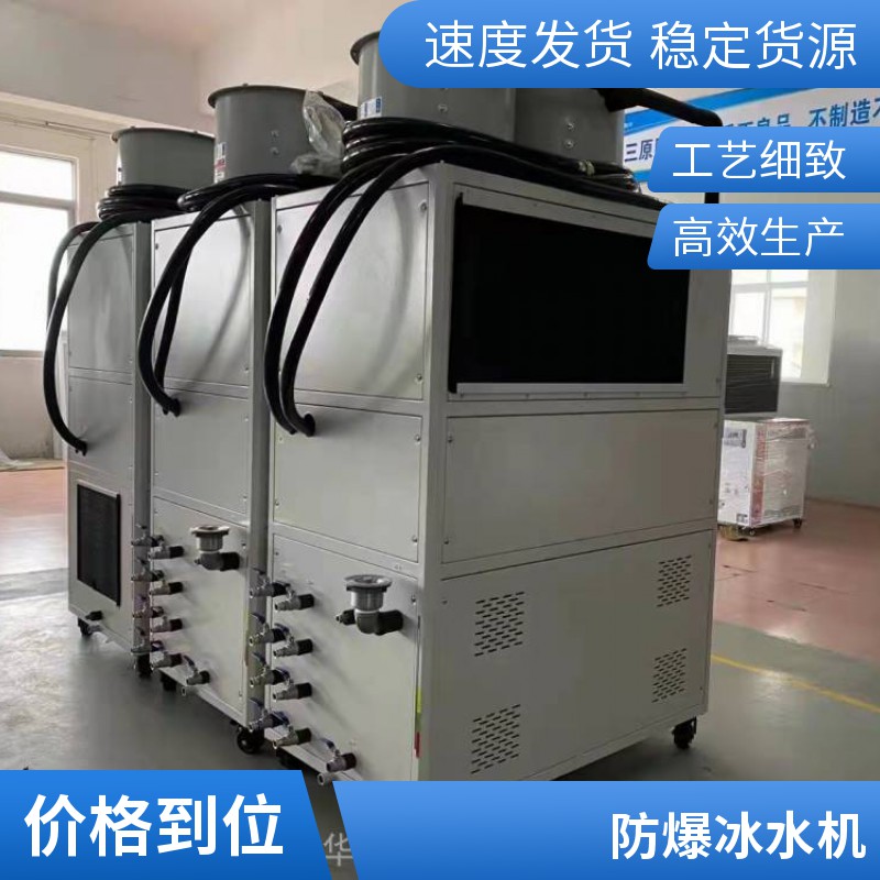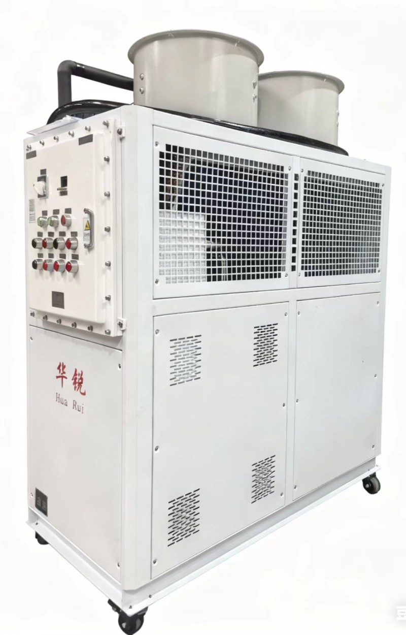 防爆冷水机各组件均按国家防爆标准制造,防爆主要控制器根据GB3836.1-2000《爆炸性气体环境用电气设备通用要求》、GB3836.2-2000《爆炸性气体环境用电设备隔爆型“d”》和GB3836.3-2000《爆炸性气体环境用电气设备增安型“e”》的规定而设计制造,能够满足特殊环境要求。 华锐防爆制冷机组适用范围: 1、爆炸性气体混合物危险场所:1区、2区。 2、爆炸性气体混合物:ⅡA、ⅡB、ⅡC。 3、温度组别:T1-T4。 4、防爆等级为:EXdmibⅡBT4; 特种制冷设备防暴冷水机组,防暴冷冻机组主要特点: 1、防爆冷水机采用半封闭双螺杆压缩机或全封闭涡旋式压缩机,节能、高效、稳定,其具有运动部件少,稳定、高效、故障率低等特点; 2、防爆式工业冷冻机主要部件均为丹佛斯Danfoss、ALCO、Emerson、Carly等*品牌元件,采用西门子Siemens工业级PLC可编程控制器,大屏幕液晶显示界面;自动/手动切换,自动化程度高; 3、防爆冷水机组提供从制冷剂系统、电控系统、水处理系统的保护,完全确保机组安全正常地运行。压缩机设置电机过热、过电流、相序异常、油位过低、低压、高压等保护;具有高效、节能、稳定、安全等特点;特种制冷设备防暴冷水机组 防暴冷冻机组